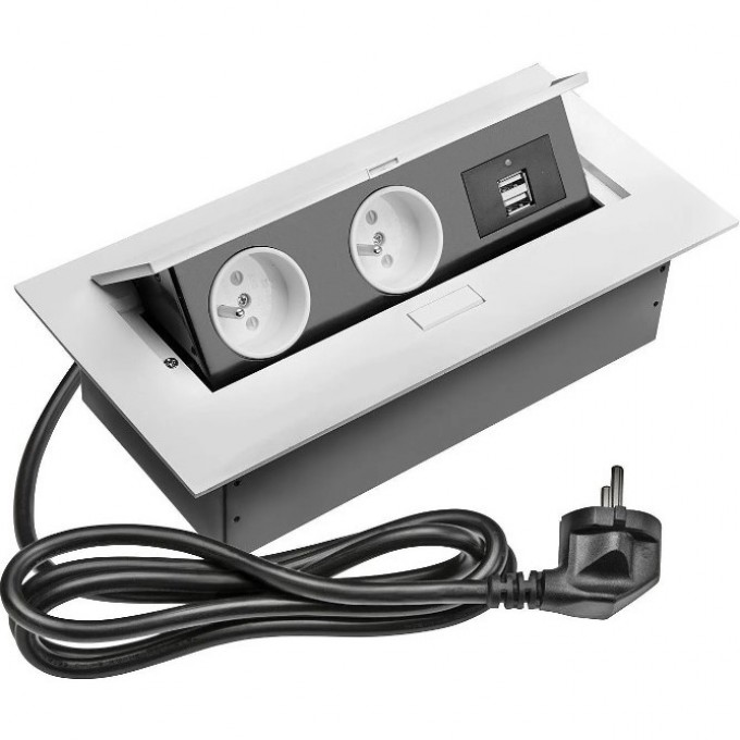 Удлинитель прямоугольный врезной 2 розетки AE-PBU2GU-10 (French) 2xUSB,белый, с проводом 1,5 метра - полезный функциональный элемент интерьера вашего офиса или комнаты. Устройство устанавливается в столешницу и в «спящем» состоянии скрыто от ваших глаз. Как только потребуется розетка, вы легким нажатием откроете рабочую зону удлинителя и подключите компьютер, телефон, светильник или иной гаджет к электросети. Данная модель относится к типу French - розетка оснащена контактом в виде штыря. У подавляющего большинства моделей современной техники вилка подходит к данной розетке. ПРЕИМУЩЕСТВА USB-разъемы удобны для подзарядки планшетов, мобильных телефонов, MP3-плееров и других гаджетов.